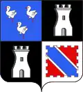 Coupé : au 1, parti d'azur à une tour d'or ouverte et ajourée de sable surmontée de trois étoiles rangées en chef d'argent, et de gueules à l'épée haute d'argent ; au 2, d'or à un pont de sable de quatre arches soutenu d'une rivière de sinople en champagne.[20] |