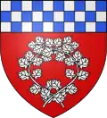 De gueules, à une couronne de deux branches de laurier d’argent ; au chef échiqueté d’argent et d’azur de 3 tires |