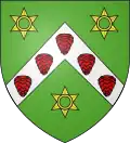D'azur à trois pommes de pin d'or, au chef de même ; écartelé de gueules au lion d'or.[Rivoire 12] |