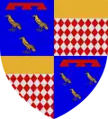D'argent au treillis de gueules, cloué d'or, à la bande d'azur chargée de trois fleurs de lys d'or brochant sur le tout.[Rivoire 22] |