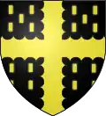 Émanché en fasce d'or et d'azur, de six pièces, et deux demies, les extrémités pommetées.[Rivoire 4] |
