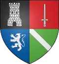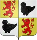 De sable au lion d'or armé, lampassé et couronné de gueules ; à la fasce partie d'argent et d'azur, chargée de deux étoiles de l'un en l'autre brochant sur le tout.[Rivoire 14] |
