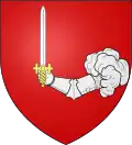 De gueules à la dextrochère d'argent, armé de toutes pièces, tenant une épée de même la pointe en haut, la garde et la poignée d'or, mouvant d'un nuage aussi d'argent, posé au flanc droit de l'écu.[Rivoire 20] |