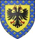 D'or, à trois bandes d'azur.[Rivoire 6] Alias : Mi-parti de France ancien et de Toulouse ; sur le tout d'or à trois bandes d'azur.[3] Ornements extérieurs : Lancea sacra tracés sur une banderole d'argent, attachée au fer d'une lance que tient un lion d'or, issant d'une couronne ducale. |