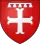 D'azur à la croix pattée (alias alésée) d'argent.[45] Alias d'azur à trois croix pattées d'argent.[45]