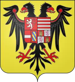 d'or, à l'aigle bicéphale de sable, membrée, becquée et armée de gueules ; sur le tout parti en 1 de gueules à la fasce d'argent, en 2 bandé d'or et d'azur de six pièces à la bordure de gueules[58]. |