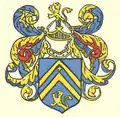 tiercé en fasce d'azur, de gueules et d'or, les gueules chargé d'une équerre d'or entre deux roses d'argent.[4] |
