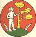 de gueules à un enfant d'argent, tourné à senestre, empiétant un mont de sinople, tenant un arbre d'or mouvant du mont et accompagné de deux feuilles de tulipe d'argent mouvant elles aussi du mont.[4] |