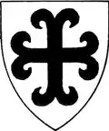 d'azur à une croix alaisée d'or, chargée d'un point de gueules en abîme, accompagnée en chef de trois besants d'argent, en pointe de deux rinceaux du même, mouvant d'un mont de trois coupeaux d'or.[4] |