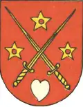 de gueules à deux épées d'or (parfois des pistolets d'arçon) mises en sautoir, accompagnées de trois étoiles du même, une en chef, deux aux flancs et d'un cœur d'argent en pointe.[3] |
