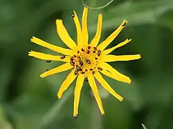 De même, deux mineuses semblent parasiter les feuilles d'Arnica montana. Il s'agit de la chenille du lépidoptère Digitivalva arnicella de la famille des Yponomeutidae[30],[31] ainsi que de la larve du diptère Phytomyza arnicae de la famille Agromyzidae[32]. Un autre diptère, Melanagromyza arnicarum (du genre Melanagromyza) creuse la tige et se transforme en pupe dans les rhizomes. Enfin, les capitules peuvent être habités par de petits coléoptères du genre Meligethes, qui se nourrissent de son pollen[33].