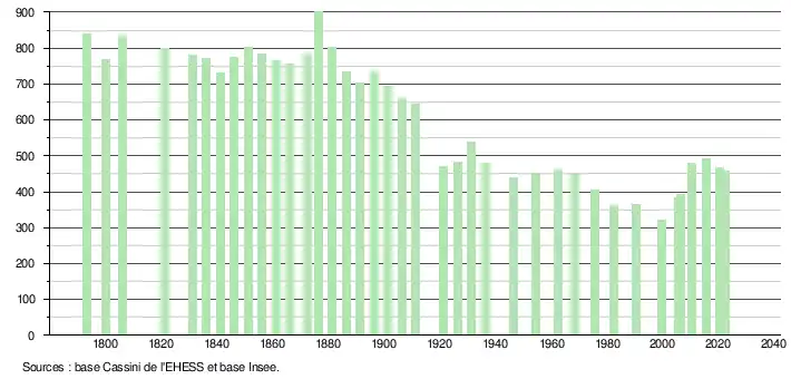 L'évolution du nombre d'habitants est connue à travers les recensements de la population effectués dans la commune depuis 1793. Pour les communes de moins de 10 000 habitants, une enquête de recensement portant sur toute la population est réalisée tous les cinq ans, les populations de référence des années intermédiaires étant quant à elles estimées par interpolation ou extrapolation[21]. Pour la commune, le premier recensement exhaustif entrant dans le cadre du nouveau dispositif a été réalisé en 2005[22].