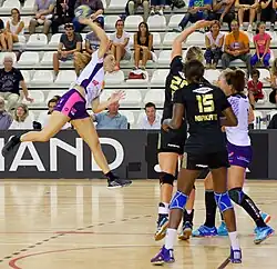 - il peut sauter et effectuer un tir en extension pour marquer un but. Cette alternative se présente plus souvent pour des arrières de taille importante qui peuvent tirer par-dessus la défense.