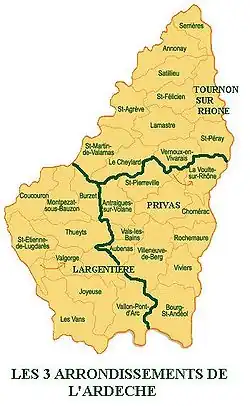 - Vallon-Pont-d'Arc (29 communes ; l'autre est dans l'arrondissement de Privas) ;