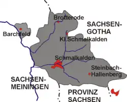 Au lendemain de la guerre austro-prussienne en 1866, la Prusse annexe l'électorat de Hesse et, avec le duché de Nassau, le transforme le 7 décembre 1868 en province de Hesse-Nassau. L'arrondissement de Schmalkalden est affecté au district de Cassel. À partir du 26 avril 1907, l'arrondissement s'appelle seigneurie de Schmalkalden.