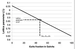 Ga0.47In0.53As est l'alliage dont le paramètre de maille est égal celui de InP à 295 K. Le GaInAs dont le paramètre de maille est identique à celui de InP est un semi-conducteur aux propriétés assez différentes de celles de GaAs, InAs ou InP. Il a une largeur de bande interdite de 0,75 eV, une masse effective des électrons de 0,041 et une mobilité des électrons voisine de 10000 cm2·V−1·s−1 à température ambiante, toutes ces propriétés sont plus favorables pour beaucoup de composants électroniques et photoniques que celles de GaAs, InP ou même Si[1]. Les mesures de la largeur de bande interdite et de la mobilité des électrons de monocristaux de GaInAs furent publiées pour la première fois par Takeda et al[10].