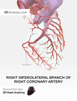 L'artère coronaire droite donne d'autres branches : les rameaux atrial et atrial intermédiaire à destination de l'oreillette droite et le rameau ventriculaire antérieur à destination du ventricule droit.