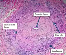 Sur le plan histopathologique, il s’agit d’une panartérite (atteinte des trois tuniques de la paroi des artères) segmentaire (atteinte discontinue) et plurifocale (atteinte pouvant être localisée sur plusieurs zones de l'organisme) à cellules géantes (en). La paroi des artères atteintes présente trois types de lésions associées ou non à la présence de cellules géantes :