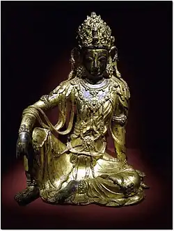 Maitreya en méditation. Bronze doré. 93.5 cm. Corée, fin VIe-début VIIe, probablement Silla en cours d'unification[57] Musée national de Corée