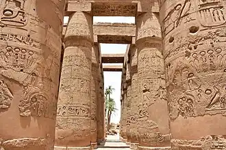 Emblématique de l'architecture sacrée en Égypte, la grande salle hypostyle du temple d'Amon-Rê à Karnak crée une sensation d'égarement tant les colonnes, immenses et énormes, sont rapprochées : l'homme s'y sent infiniment petit ; cette sensation redouble le sentiment de la présence du divin, pour l'égyptien de l'antiquité. Cette salle immense n'était pas conçue pour recevoir une foule mais pour accueillir et conserver la barque solaire[5]. Les colonnes énormes et rapprochées, élevées sous Amenhotep III (Nouvel Empire)[6], s'inscrivent dans la continuité de ses prédécesseurs immédiats : les dieux sont adorés dans l'ombre, derrière de hauts murs (à l'inverse des temples éphémères dédiés à Aton, construits sous Akhenaton (Amenhotep IV), à ciel ouvert, et sans lendemain). Le message est aussi inscrit dans la pierre, jusqu'au sommet de l'édifice. Les colonnes s'élèvent jusqu'à leurs chapiteaux en forme de « fleurs »[7]. Les colonnes égyptiennes symbolisent la forêt originelle de papyrus portant le ciel[8]. Les fleurs des chapiteaux, plongées dans l'ombre des bas-côtés, restent fermées ou « en bouton », mais en corolles « ouvertes », dans la nef centrale. La lumière solaire pénètre l'espace du temple sur les côtés de la nef centrale[9], et ruisselle sur les colonnes depuis les chapiteaux, souvent peints de couleurs vives.