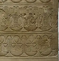 - ↑ Une statue familiale de sanctuaire : le groupe de Senpou. H. 20,5 cm, figure : calcaire lithographique, monument : calcaire, table d'offrande: albâtre, incrustations de pâte bleu-vert : « Ce monument constituait une stèle chapelle destinée à procurer au défunt et à sa famille le bénéfice des cérémonies accomplies dans le sanctuaire. »