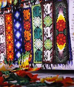 L'art le plus connu des Huichols est fabriqué à partir d'objets modernes et commerciaux, tels que des fils et des petites perles. Les Tepehuánes de Durango adaptent les peintures au fil. Celles-ci remplacent de nombreux matériaux traditionnels tels que l'argile, la pierre et les colorants végétaux[1]. La fabrication et la décoration d'objets avec des perles ne commencent pas par l'importation de perles de verre européennes, comme c'est le cas pour un certain nombre de cultures autochtones du Grand Nord. Les techniques de fabrication et d'utilisation des perles sont bien en place bien avant cela, utilisant des perles d'os, d'argile, de pierre, de corail, de turquoise, de pyrite, de jade et de graines[1]. L'art Huichol est cité pour la première fois à la fin du XIXe siècle par Carl Lumholtz. Cela comprend la fabrication de boucles d'oreilles, de colliers, de bracelets de cheville, etc.[1].
