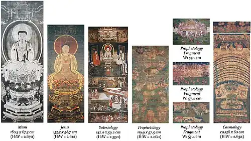 La bannière du temple manichéen MIK III 6286 et la peinture murale manichée MIK III 6918 ont toutes deux été trouvées par les expéditions allemandes Turfan à Gaochang Xinjiang [9],[10]