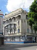L'immeuble, qui date des années 1907-1908, est composé de deux propriétés unies par un couronnement orné d'une tête de méduse[4].