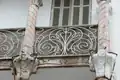 Les balcons des trois étages sont liés par des colonnes torses en marbre rose et couronnés par des chapiteaux à motifs floraux[9]. Les motifs ondoyants des ferronneries des balcons sont caractéristiques de l'Art nouveau[9]. Les baies du dernier étage ont des impostes en mosaïque représentant un bouquet de bleuets[9].