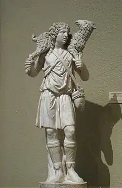 - Le Christ en Bon Pasteur: l'image du Bon Pasteur est une représentation inspirée de l'art romain contemporain. Il s'agit d'un jeune homme imberbe vêtu d'une tunique courte ceinturée à la taille, et portant un mouton ou un agneau sur ses épaules. Cette représentation montre, d'une part, la double nature du Christ, à la fois humain et divin, et donc échappant aux aléas du temps. D'autre part, le choix de cette représentation est à lier avec le fait que le Christ est comparé à un berger prêt à se sacrifier pour un seul des moutons de son troupeau[9].