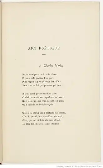 Art poétique est un poème de Paul Verlaine écrit en avril 1874 et publié postérieurement chez l'éditeur Léon Vanier, en 1882, dans la revue littéraire et artistique Paris moderne[1], puis en 1884 dans le recueil Jadis et Naguère[2].