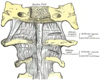 - la membrane atlanto-occipitale antérieure entre l'arc antérieur de l'atlas et le bord antérieur du foramen magnum renforcée par le ligament atlanto-occipital antérieur.
