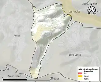 Le retrait-gonflement des sols argileux est susceptible d'engendrer des dommages importants aux bâtiments en cas d’alternance de périodes de sécheresse et de pluie. 0,4 % de la superficie communale est en aléa moyen ou fort (44,5 % au niveau départemental et 48,5 % au niveau national). Sur les 7 bâtiments dénombrés sur la commune en 2019, 0 sont en aléa moyen ou fort, soit 0 %, à comparer aux 75 % au niveau départemental et 54 % au niveau national. Une cartographie de l'exposition du territoire national au retrait gonflement des sols argileux est disponible sur le site du BRGM[28],[Carte 3].