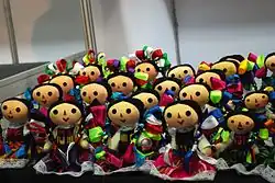 Une catégorie importante de jouets est celle des poupées. Elles sont fabriquées à partir de divers matériaux et certaines sont devenus emblématiques. Oaxaca est célèbre pour ses chiens en chiffon, vêtus de vêtements indigènes locaux[24]. À Mexico, des poupées appelées « Marías » sont également fabriquées en tissu et habillées de manière à imiter les femmes autochtones. Celles-ci portent souvent des bébés et sont également ornés de rubans et de franges ou de dentelles[24]. Les poupées María sont bien connues des touristes mexicains, même s'ils ne savent pas comment on les appelle. Elles sont en tissu et sont habillées de la même manière que les femmes Mazahua (en), un groupe autochtone de l’État de Mexico et du Michoacán. Elles sont souvent vendues dans la rue par des femmes qui les fabriquent. Le rembourrage est un matériau appelé guata, qui est conçu à cet effet. Culturellement, elles sont importantes car elles présentent une image mexicaine traditionnelle, contrairement aux poupées fabriquées dans le commerce[25]. Moins connues sont les poupées de Cartonería, ou Lupita, qui sont en papier mâché très dur. Elles sont créées à l'origine pour imiter des poupées de porcelaine chères d'Europe[11],[15]. Une autre « poupée » de style européen est la marionnette. Les marionnettes traditionnelles sont fabriquées à Puebla avec un tissu de couleur vive pour le corps et les appendices, mais les mains, les pieds et la tête sont en céramique. De manière générale, elles représentent des sorcières, des toreros, des diables, des chevaux et des clowns, ainsi que des personnages célèbres tels que Don Juan Tenorio et sa promise Doña Inés[24]. Les marionnettes sont les vedettes de spectacles, souvent présentés par des individus ou des groupes itinérants lors de foires et de fêtes locales et les théâtres de marionnettes miniatures à la maison deviennent populaires au XIXe siècle et le restent jusqu'au milieu du XXe siècle. Ils sont également utilisés pour enseigner la doctrine catholique aux enfants. Au début du XXe siècle, ces marionnettes comprennent également des personnages plus modernes et internationaux tels que Popeye, Charlie Chaplin, Cantinflas et des soldats[11]. Les cosses de maïs sont utilisées de diverses manières, notamment pour la fabrication d'objets artisanaux tels que des jouets, dont beaucoup de petites poupées. Les enveloppes sont enroulées autour d'herbes en boule, d'un épi de maïs ou de bambou. Après l'assemblage, les pièces sont peintes de couleurs vives avec des colorants à l'aniline[26].