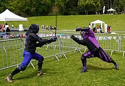 - enfin, pour les armes dont la forme des gestes techniques s'est plus ou moins stabilisée dans la communauté (lutte, épée longue, sabre...), les AMHE peuvent aboutir à des tournois de caractère sportif et compétitif[17],[18] avec un équipement de protection moderne.