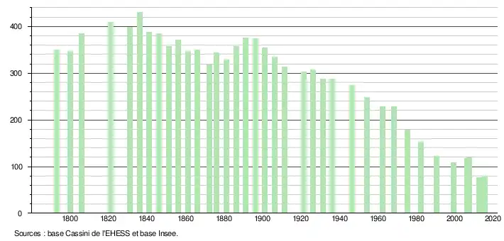 L'évolution du nombre d'habitants est connue à travers les recensements de la population effectués dans la commune depuis 1793. Pour les communes de moins de 10 000 habitants, une enquête de recensement portant sur toute la population est réalisée tous les cinq ans, les populations de référence des années intermédiaires étant quant à elles estimées par interpolation ou extrapolation[3]. Pour la commune, le premier recensement exhaustif entrant dans le cadre du nouveau dispositif a été réalisé en 2007[4].