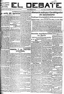 Face à cette tentative, le journal El Debate et toutes les forces catholiques mises en alerte se mobilisèrent, décidant d’organiser un grand rassemblement en défense de l’enseignement catholique[35]. Pour couper court à cette mobilisation, le président Romanones accomplit deux démarches tactiques, l’une devant le Saint-Siège, obtenant que la nonciature demande que le rassemblement de masse projeté soit différé moyennant que le gouvernement donne des garanties suffisantes, et l’autre auprès de l’évêque de Madrid, en lui fournissant les garanties demandées par Rome. Il en résulta que ce qui devait être un rassemblement monstre fut reporté sine die[36].