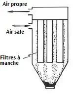 Un filtre en tissu est un média filtrant fabriqué à partir d'un matériau textile tissé ou non tissé ou d'une combinaison des deux[3]. La filtration consiste à faire passer la veine d’air chargée de poussières à travers un filtre. Lors du passage, les particules sont retenues par ce filtre et, surtout, par la couche de poussières déjà déposées préalablement, le textile fournissant le substrat de support. Cette couche est appelée gâteau. De façon à en maîtriser l’épaisseur, les appareils sont équipés d’un système de décolmatage qui assure le nettoyage séquentiel du média.