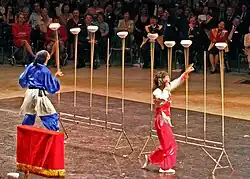 Les artistes occidentaux d’assiette tournante présentent généralement des numéros de comédie et disposent d’un interprète avec un assistant, tournant plusieurs assiettes sur des bâtons maintenus verticalement.