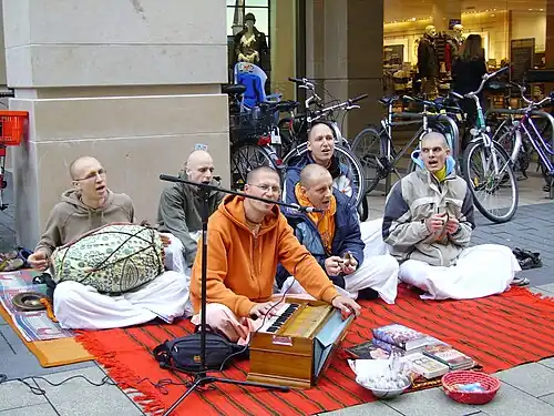 Les hommes, vêtus de leurs dhotis (pagnes indiens traditionnels) safrans (pour les célibataires) ou blanches (les femmes portent le sari), chantent dans les rues, offrant livres et disques concernant Krishna[3], le visage de tous orné d'un tilak, le crâne des hommes devant être couronné du shika, ou choti, la touffe de cheveux brahmanique située en haut du crâne (toujours plus longue que le reste de la chevelure, même si le reste du crâne n'est pas rasé complètement), et que peut porter tout hindou, sans distinction de courants religieux ou de communautés, et tout particulièrement les dvija, « deux-fois-nés », initiés aux Védas, et surtout leurs maîtres religieux, les brâhmanes : le corps étant considéré comme un temple, le tilak (marque frontale à l'emplacement du troisième œil) représente la divinité adorée sous une forme stylisée à l'extrême, et le shikha ou choti est le « drapeau » du temple de l'âme qu'est le corps, de même que le temple, palais de Dieu, est orné d'un drapeau à son sommet.