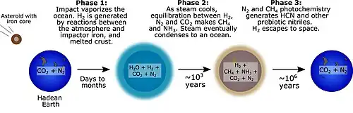 Le flux important d'impacteurs au début du système solaire aurait pu modifier considérablement la nature de l'atmosphère prébiotique. Au cours de la période de l'atmosphère prébiotique, il a pu se produire quelques impacts d'astéroïdes suffisamment importants pour vaporiser les océans et faire fondre la surface de la Terre, avec des impacts plus faibles mais en nombre important[45],[3],[46]. Ces impacts auraient considérablement modifié la chimie de l’atmosphère prébiotique en la réchauffant, en en éjectant une partie dans l’espace et en y délivrant de nouvelles matières chimiques. Certaines études sur les atmosphères post-impact indiquent qu'ils auraient entraîné une forte réduction de l'atmosphère prébiotique pendant un certain temps après un impact important[3],[11],[47]. En moyenne, les impacteurs des premiers temps du système solaire contenaient des minéraux hautement réduits (par exemple du fer métallique) et étaient enrichis de composés réduits qui pénètrent facilement dans l'atmosphère sous forme de gaz[11]. Dans ces atmosphères fortement réduites après impact, des quantités significativement plus élevées de gaz réduits comme le CH4 (méthane), le HCN (cyanure d'hydrogène) et peut-être le NH3 (ammoniac) seraient présentes. Les atmosphères réduites post-impact après la condensation de l'océan devraient durer jusqu'à des dizaines de millions d'années avant de revenir à l'état stable[11].