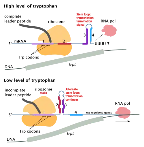 - ↑ Merino E, Yanofsky C (2005). "Transcription attenuation: a highly conserved regulatory strategy used by bacteria." Trends Genet 21:260–4.
