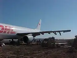 Ce faisant, il est entré dans une zone délimitée par des fils barbelés, qui ont déchiré plusieurs pneus ainsi que le toboggan d'évacuation gauche. L'ordre est donc donné d'évacuer par le toboggan droit, intact. L'équipage constate par lui-même les dégâts, puis se dirige vers la piste afin de regagner les locaux de l'aéroport[1].
