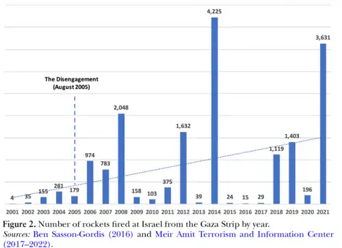 « Depuis 2001, date à laquelle les roquettes ont été tirées pour la première fois, plus de 8 600 ont frappé le sud d'Israël, dont près de 6 000 depuis le retrait d'Israël de Gaza en août 2005. Les roquettes ont tué 28 personnes et en ont blessé des centaines d'autres. Dans la ville israélienne de Sderot, près de Gaza, 90 % des habitants ont déjà vu un missile exploser dans leur rue ou dans une rue adjacente. La portée des missiles augmente. La roquette Qassam (du nom d'un dirigeant palestinien dans les années 1930) a une portée d'environ 10 km (6 miles) mais des missiles plus avancés, par exemple des versions de l'ancien Grad soviétique ou Katioucha, sont introduits clandestinement. Ils ont récemment frappé la ville israélienne de Beer-Sheva, à 40 km (25 miles) de Gaza, et 800 000 Israéliens sont donc à portée de tir »[2] »