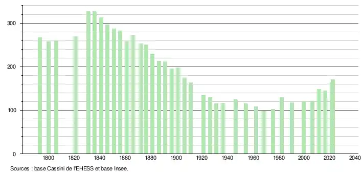 L'évolution du nombre d'habitants est connue à travers les recensements de la population effectués dans la commune depuis 1793. Pour les communes de moins de 10 000 habitants, une enquête de recensement portant sur toute la population est réalisée tous les cinq ans, les populations de référence des années intermédiaires étant quant à elles estimées par interpolation ou extrapolation[12]. Pour la commune, le premier recensement exhaustif entrant dans le cadre du nouveau dispositif a été réalisé en 2006[13].