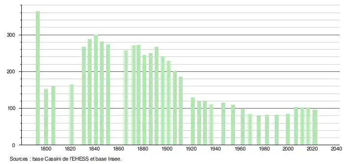 L'évolution du nombre d'habitants est connue à travers les recensements de la population effectués dans la commune depuis 1793. Pour les communes de moins de 10 000 habitants, une enquête de recensement portant sur toute la population est réalisée tous les cinq ans, les populations de référence des années intermédiaires étant quant à elles estimées par interpolation ou extrapolation[17]. Pour la commune, le premier recensement exhaustif entrant dans le cadre du nouveau dispositif a été réalisé en 2006[18].