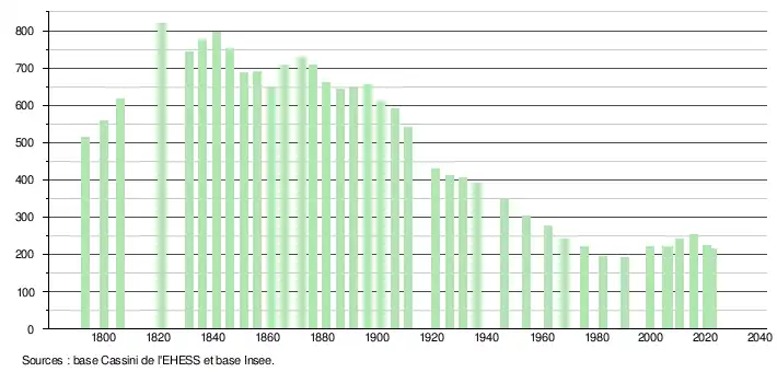 L'évolution du nombre d'habitants est connue à travers les recensements de la population effectués dans la commune depuis 1793. Pour les communes de moins de 10 000 habitants, une enquête de recensement portant sur toute la population est réalisée tous les cinq ans, les populations de référence des années intermédiaires étant quant à elles estimées par interpolation ou extrapolation[22]. Pour la commune, le premier recensement exhaustif entrant dans le cadre du nouveau dispositif a été réalisé en 2005[23].