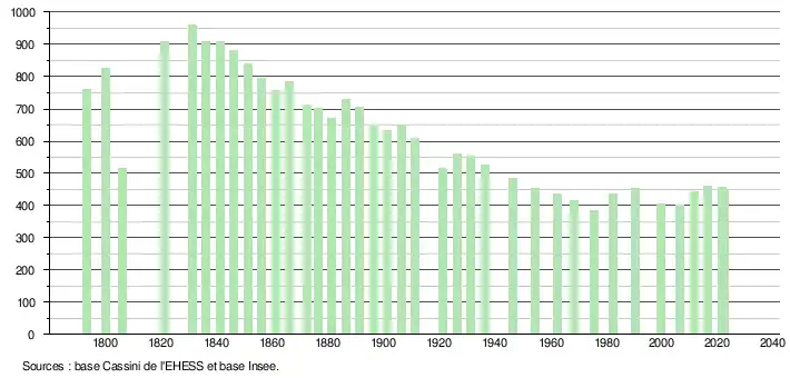 L'évolution du nombre d'habitants est connue à travers les recensements de la population effectués dans la commune depuis 1793. Pour les communes de moins de 10 000 habitants, une enquête de recensement portant sur toute la population est réalisée tous les cinq ans, les populations de référence des années intermédiaires étant quant à elles estimées par interpolation ou extrapolation[17]. Pour la commune, le premier recensement exhaustif entrant dans le cadre du nouveau dispositif a été réalisé en 2006[18].