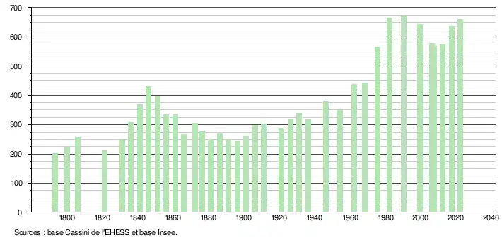 L'évolution du nombre d'habitants est connue à travers les recensements de la population effectués dans la commune depuis 1793. Pour les communes de moins de 10 000 habitants, une enquête de recensement portant sur toute la population est réalisée tous les cinq ans, les populations de référence des années intermédiaires étant quant à elles estimées par interpolation ou extrapolation[20]. Pour la commune, le premier recensement exhaustif entrant dans le cadre du nouveau dispositif a été réalisé en 2007[21].