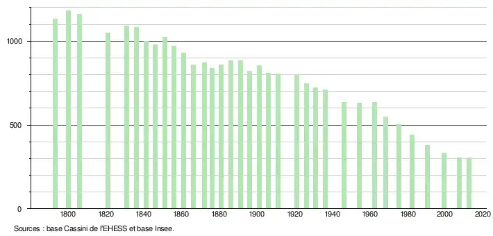 - ↑ Par convention dans Wikipédia, le principe a été retenu de n’afficher dans le tableau des recensements et le graphique, pour les populations légales postérieures à 1999, que les populations correspondant à une enquête exhaustive de recensement pour les communes de moins de 10 000 habitants, et que les populations des années 2006, 2011, 2016, etc. pour les communes de plus de 10 000 habitants, ainsi que la dernière population légale publiée par l’Insee pour l'ensemble des communes.